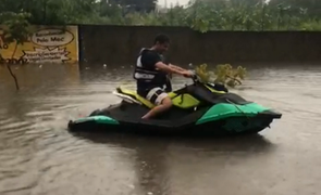 • Homem anda de jet ski em rua de Teresina após alagamento nessa terça-feira (21)