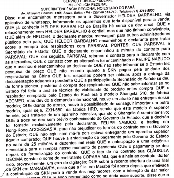 “Que Helder Barbalho encaminhou o declarante para tratar sobre a compra dos respiradores” com Parsifal Pontes, chefe da Casa Civil, a quem “encaminhou a minuta do contrato”. O contrato, com alterações, foi depois encaminhado a Felipe Nabuco, dono da SKN, “que o assinou e reencaminhou ao declarante”.